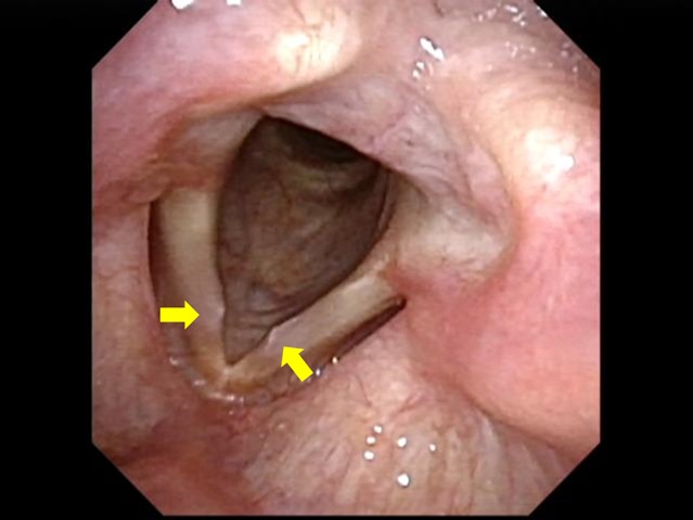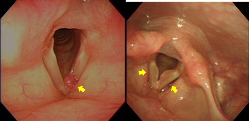 黄色の矢印が声帯結節。これは過剰な発声、本人の身体と発声能力以上の声を出しているとその結果として起こる。この結節があると、高い声で柔らかく歌う時に声嗄れが目立ってくる。運動会や生活発表会の後、こういう声帯になっている保育士さんは多い。