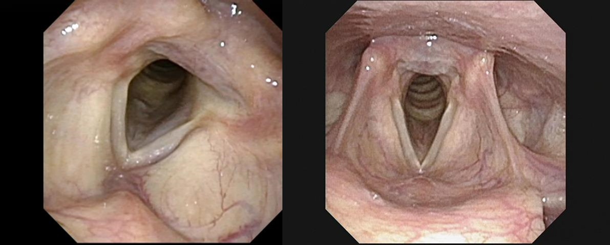腹式発声に変えても元に戻らないのが、声帯ポリープ(向かって左)とポリープ様声帯(向かって右)である。